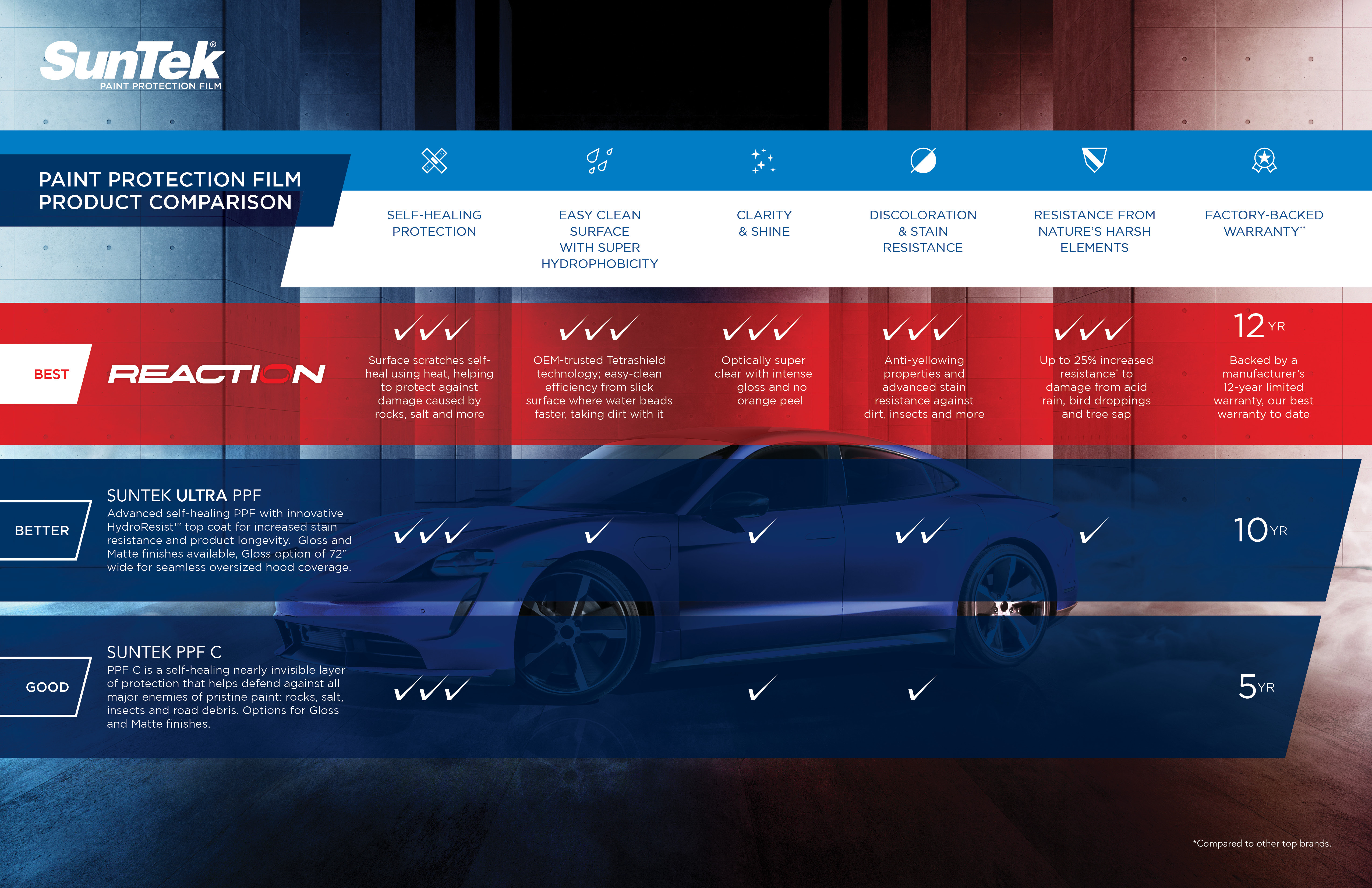 Le SunTek Ultra Gloss PPF est un paint protection film (PPF) avec une durée de vie pouvant atteindre 10 ans qui convient pour protéger un véhicule contre les gravillons, les éraflures, la lumière UV, les produits chimiques, l’humidité et les impuretés.